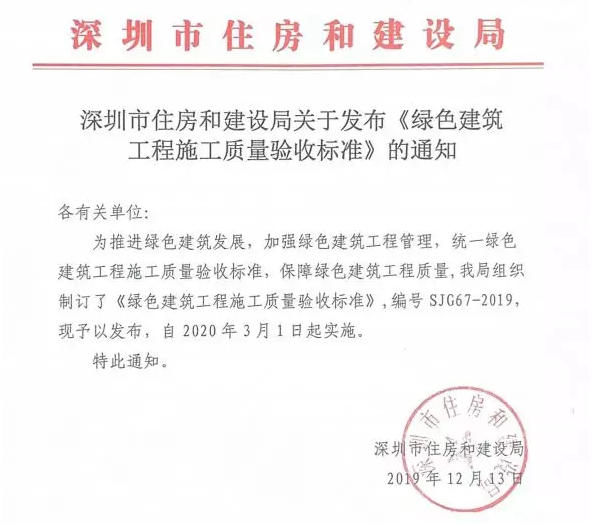 日前,深圳市住房和建設局發(fā)布通知公告,由我協(xié)會主編的《綠色建筑工程施工質(zhì)量驗收標準》正式發(fā)布,將自2020年3月1日實施。