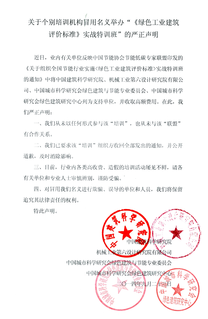 關(guān)于個別機構(gòu)冒用名義舉辦"《綠色工業(yè)建筑評價標準》實戰(zhàn)特訓(xùn)班"的嚴正聲明