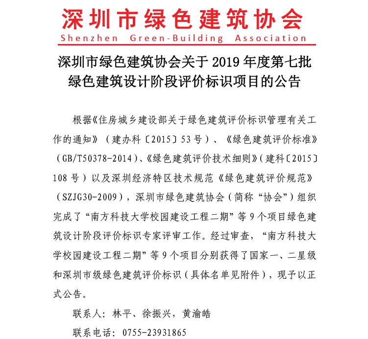 深圳市綠色建筑協(xié)會(huì)關(guān)于2019年度第七批綠色建筑評(píng)價(jià)標(biāo)識(shí)項(xiàng)目的公告