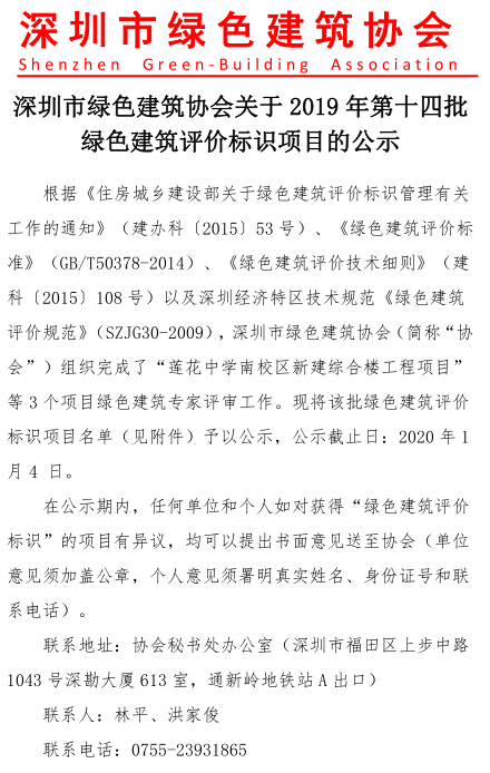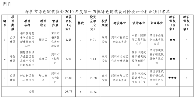 深圳市綠色建筑協(xié)會關(guān)于2019年度第十四批綠色建筑設(shè)計階段評價標(biāo)識項目的公示