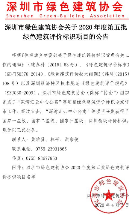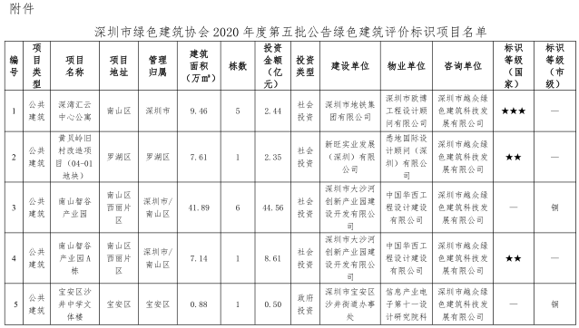 深圳市綠色建筑協(xié)會關(guān)于2020年度第五批綠色建筑評價標(biāo)識項目的公告