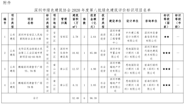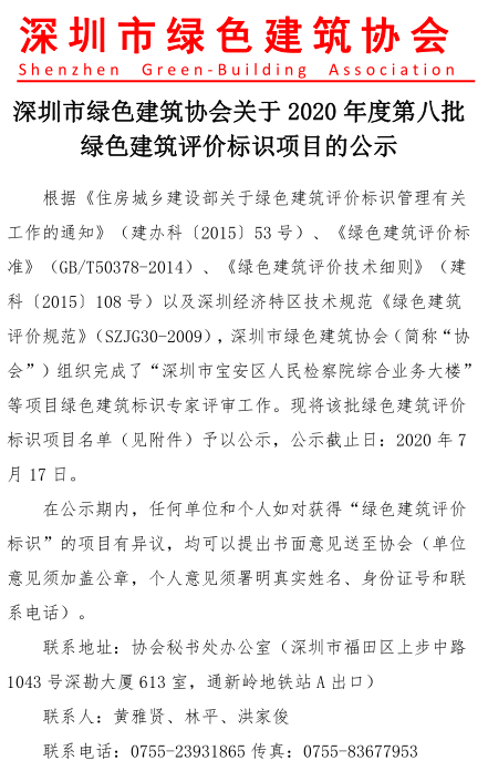 深圳市綠色建筑協(xié)會關(guān)于2020年度第八批綠色建筑評價標識項目的公示