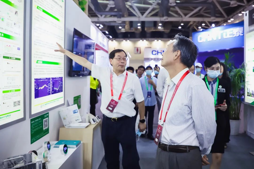 在深圳市住建局副局長高爾劍(左)的陪同下,國務(wù)院參事、住房和城鄉(xiāng)建設(shè)部原副部長、 中國城市科學(xué)研究會理事長仇保興(右)參觀深圳展區(qū)