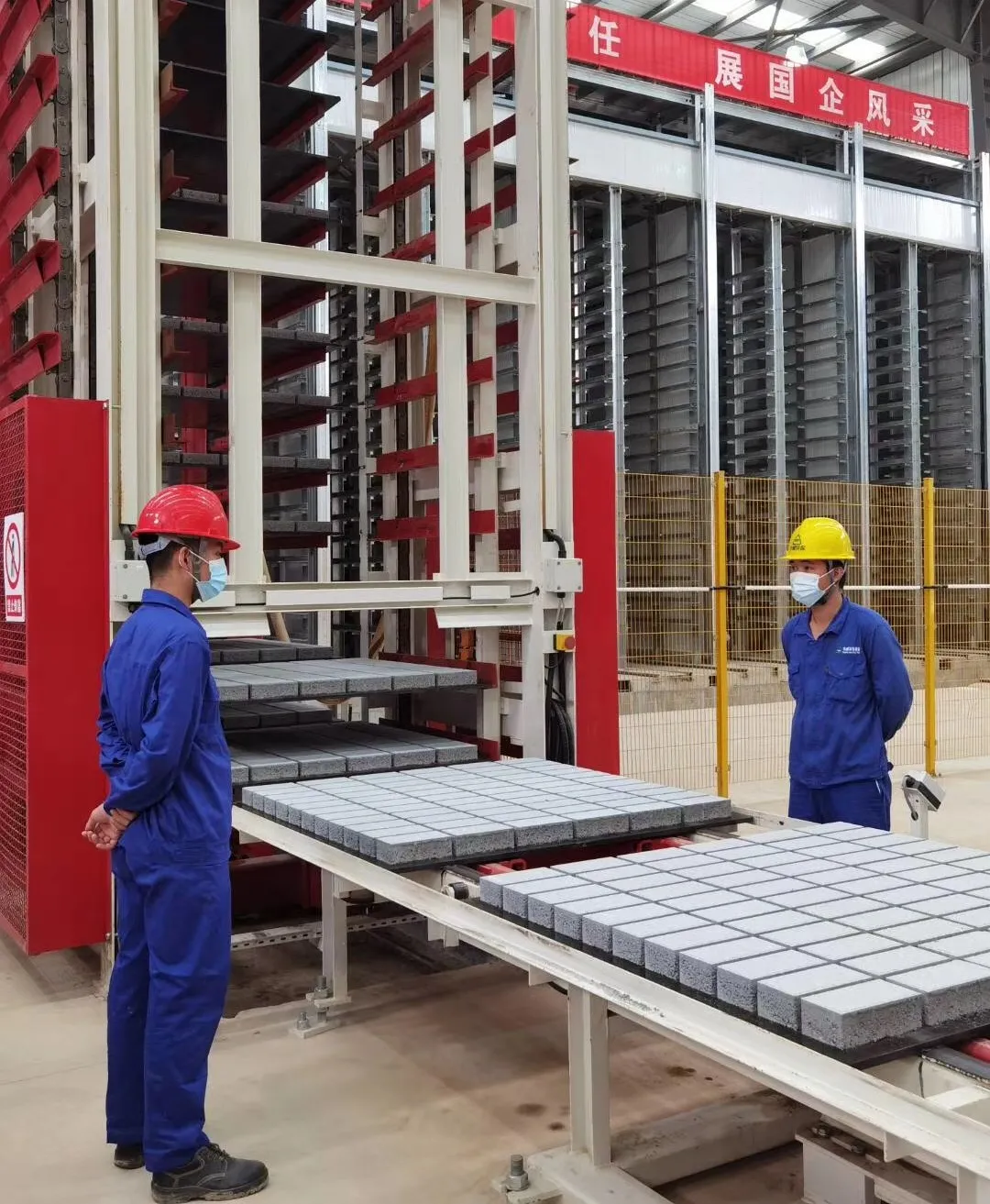 儀式結(jié)束后,領(lǐng)導(dǎo)及嘉賓參觀了大空港項目廠房及設(shè)備,并在再生砌塊生產(chǎn)車間見證了大空港項目第一批透水磚從原材料到成品僅需1分鐘就“誕生”的智能化生產(chǎn)過程。