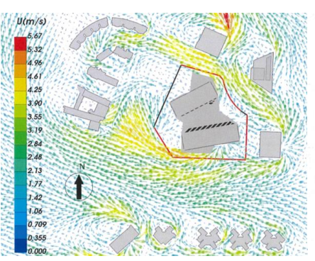 項(xiàng)目選址合理,交通便利。主要出入口500m 內(nèi)有兩個(gè)公交站臺,經(jīng)過的公交路線共15條,建筑入口、平臺、電梯、公共用房及公共衛(wèi)生間均設(shè)置無障礙設(shè)施,地下室設(shè)置無障礙停車位。采用CFD模擬軟件對建筑周邊模擬分析,優(yōu)化場地周邊風(fēng)環(huán)境。項(xiàng)目景觀分散多塊綠地,設(shè)置景觀水體和屋面綠化,且采用包含喬、灌木的復(fù)層綠化降低熱島效應(yīng)。