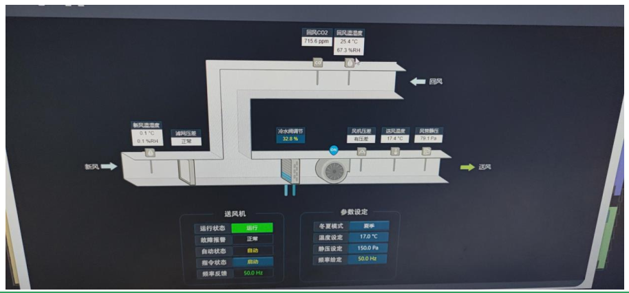 本項(xiàng)目外立面為全玻璃幕墻,玻璃幕墻可開啟面積比例大于10%,室內(nèi)空氣流動順暢,大部分空間能夠通過迎風(fēng)側(cè)進(jìn)風(fēng)氣流形成有效氣流,風(fēng)速分布在 0.31m/s~2.50m/s 范圍之內(nèi),滿足人體舒適度要求。主要功能房間通風(fēng)狀況良好,空氣齡分布在 180s 以下, 房間換氣次數(shù)不低于 2 次/h,空氣較新鮮。新風(fēng)系統(tǒng)采用粗效過濾器加中效過濾器,最大程度的過濾了PM2.5等有害顆粒,新風(fēng)量達(dá)到每人每小時(shí)45立方米。項(xiàng)目在地下室設(shè)置了 CO 濃度探測器,監(jiān)測CO濃度作為送\排風(fēng)機(jī)(換氣用途)啟停手段;大樓內(nèi)在會議室、餐廳等人多密集的空間設(shè)置CO2含量監(jiān)測并聯(lián)動控制調(diào)節(jié)新風(fēng)閥的開啟大小。
