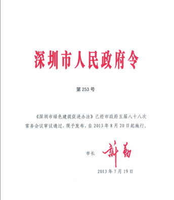 2013 年7月, 發(fā)布實(shí)施國內(nèi)第一部綠色建筑政府令《深圳市綠色建筑促進(jìn)辦法》