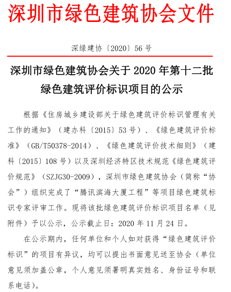 深圳市綠色建筑協(xié)會關(guān)于2020年度第十二批綠色建筑評價(jià)標(biāo)識項(xiàng)目的公示