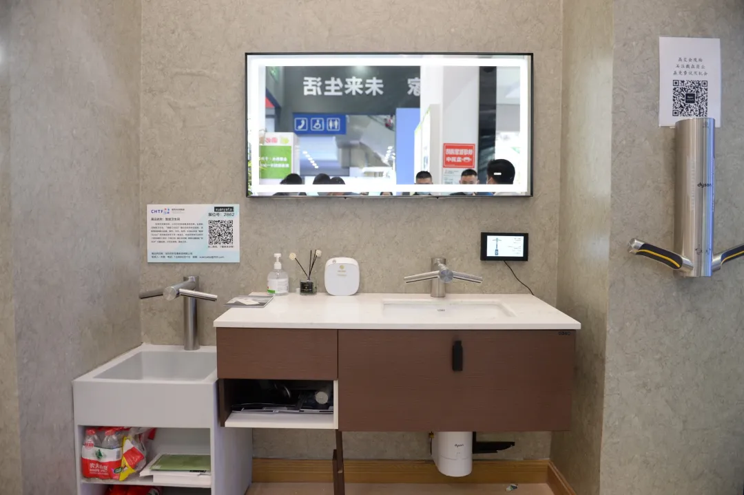 記者在智能衛(wèi)生間區(qū)域看到多項(xiàng)高科技應(yīng)用,非常智能。深圳市軒亞泰科技有限公司負(fù)責(zé)說,安裝在衛(wèi)生間的智能干手機(jī),可10秒鐘吹干雙手,干凈衛(wèi)生,屬行業(yè)創(chuàng)新;智能馬桶搭配“特利潔”馬桶坐墊,不交叉使用,更加衛(wèi)生。