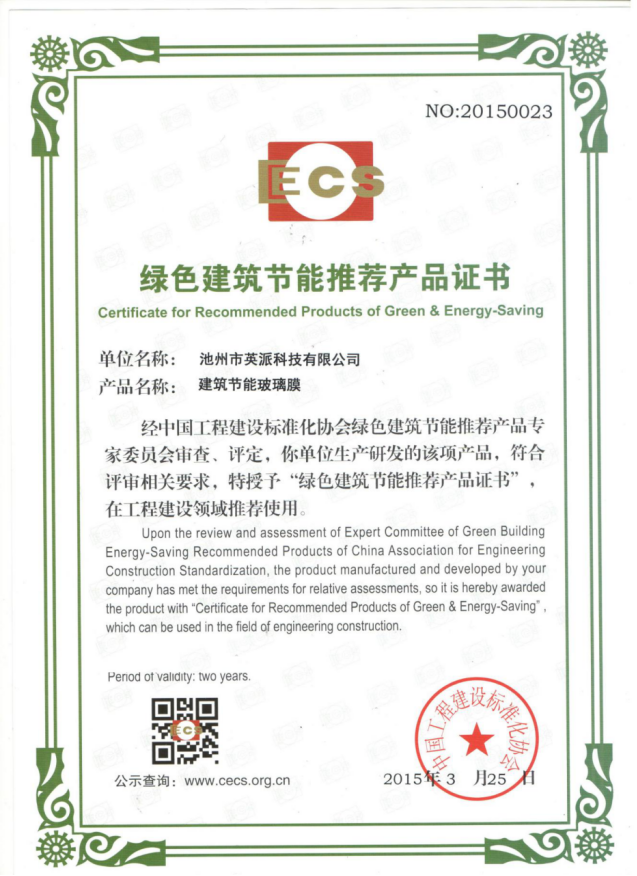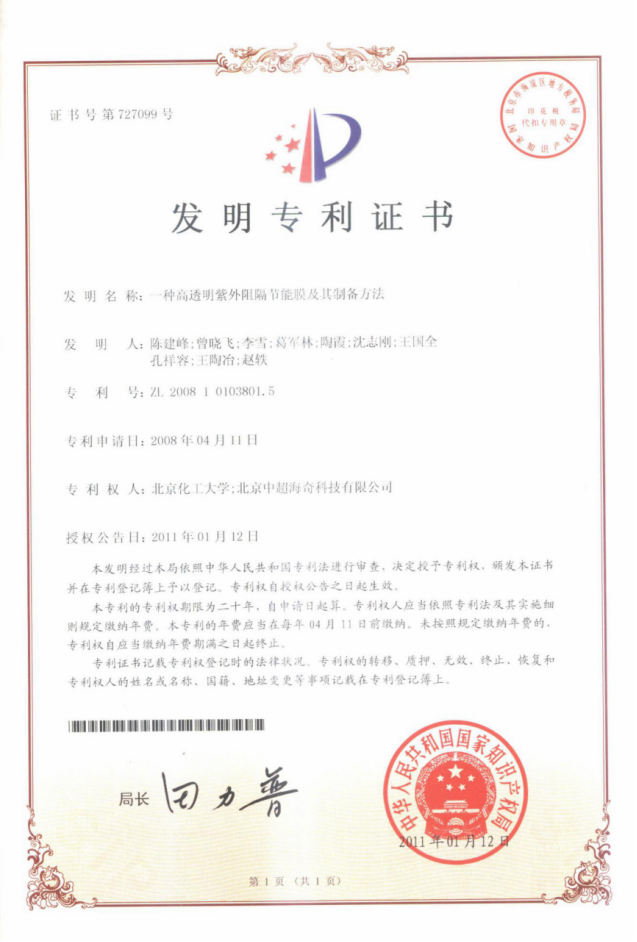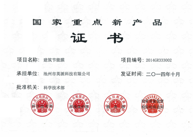 ENP漢膜建筑玻璃隔熱節(jié)能膜,該材料為我國自主知識產(chǎn)權產(chǎn)品,發(fā)明人陳建峰教授曾任北京化工大學黨委常委、副校長,2018年6月?lián)沃袊こ淘好貢L。該產(chǎn)品是目前國家住建部推廣的唯一一款玻璃隔熱節(jié)能膜產(chǎn)品,獲得安徽、江蘇、湖南、重慶等省推廣證書。