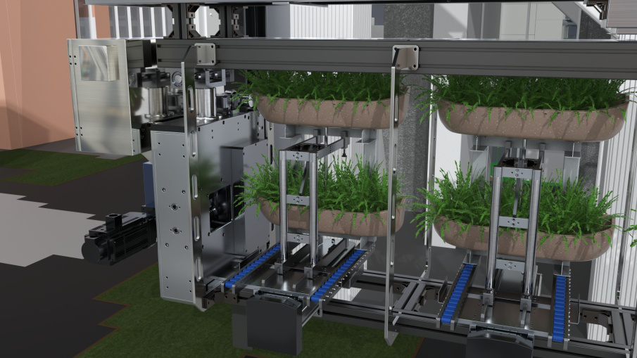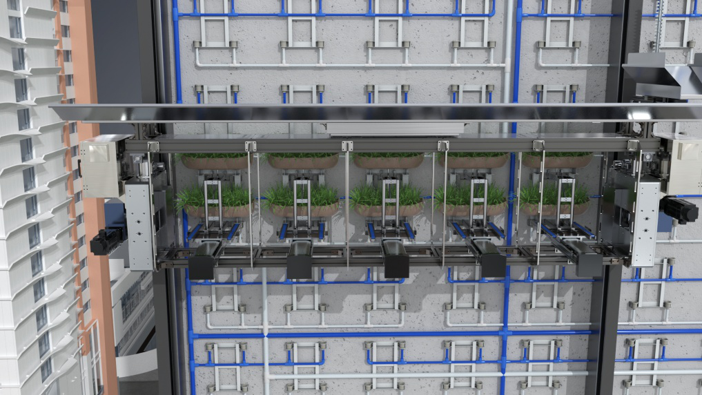 智能呼吸幕墻系統(tǒng)以裝配化、集成化、自動化、智能化為核心優(yōu)勢,是一套足以革新現(xiàn)有垂直綠化工藝的全新系統(tǒng)。整套系統(tǒng)包括預裝支撐結構、機器人安裝平臺、智能運維平臺三大部分,重量約為80~100kg/㎡,實現(xiàn)了自動取放植物模塊、自動修剪植物枝葉、自動蓄水有組織排水、后期智能運維等多種功能,有效推動垂直綠化向高空發(fā)展。