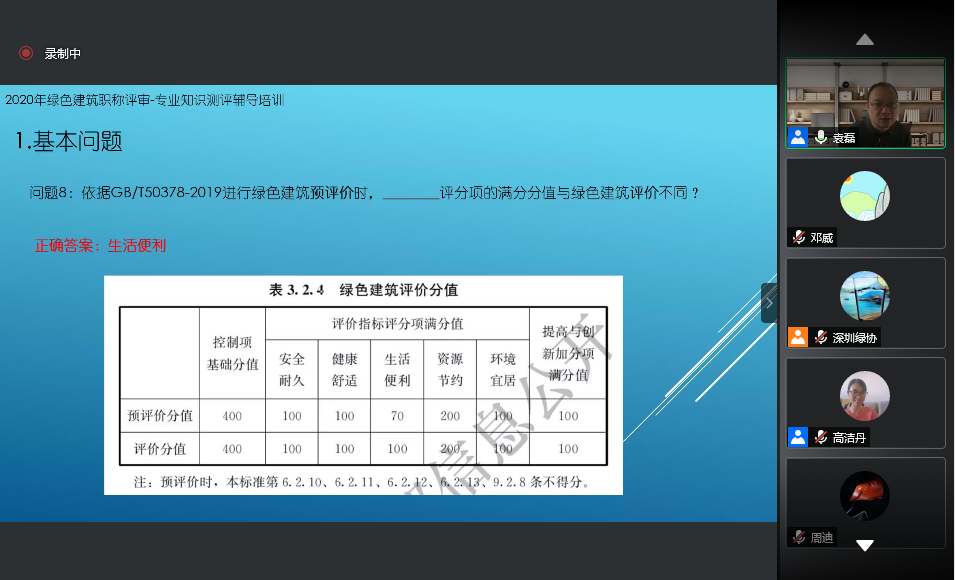 新年伊始,萬(wàn)象更新。深圳市綠色建筑協(xié)會(huì)作為深圳市綠色建筑專(zhuān)業(yè)職稱(chēng)評(píng)審日常工作部門(mén),在行業(yè)專(zhuān)家的支持下,于2月25日舉辦了“2020年度綠色建筑職稱(chēng)評(píng)審——專(zhuān)業(yè)知識(shí)測(cè)評(píng)輔導(dǎo)培訓(xùn)班”。授課專(zhuān)家為本年度綠色建筑職稱(chēng)申報(bào)人員梳理、講解綠色建筑專(zhuān)業(yè)知識(shí)、答疑解惑,本次培訓(xùn)為高效推進(jìn)職稱(chēng)測(cè)評(píng)、提升申報(bào)人員專(zhuān)業(yè)技術(shù)水平,起到了積極促進(jìn)作用。培訓(xùn)采取線上會(huì)議方式進(jìn)行,吸引了200余人參加。