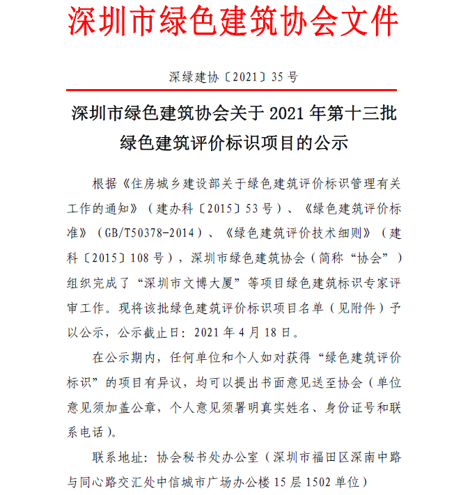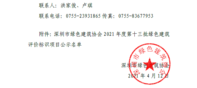 深圳市綠色建筑協(xié)會(huì)關(guān)于2021 年第十三批綠色建筑評(píng)價(jià)標(biāo)識(shí)項(xiàng)目的公示