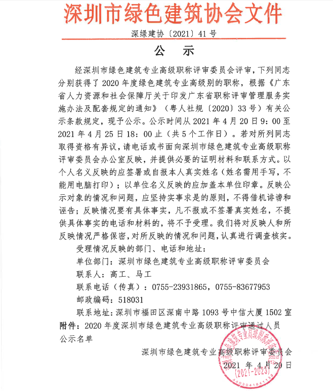 2020年度深圳市綠色建筑專業(yè)高級職稱評審?fù)ㄟ^人員名單公示