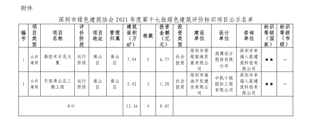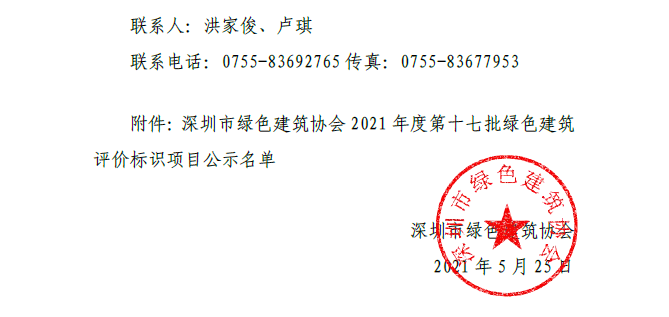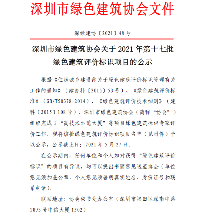 深圳市綠色建筑協(xié)會(huì)關(guān)于2021年第十七批綠色建筑評(píng)價(jià)標(biāo)識(shí)項(xiàng)目的公示