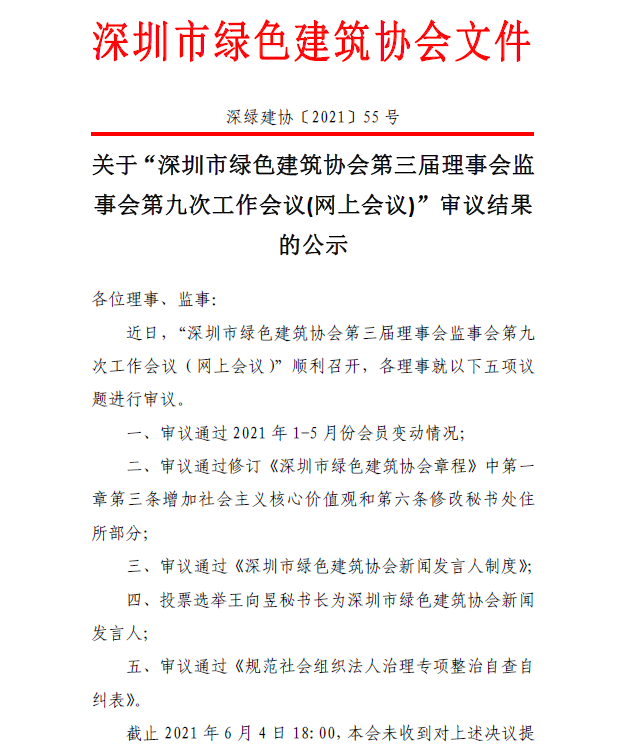 關(guān)于“深圳市綠色建筑協(xié)會(huì)第三屆理事會(huì)監(jiān)事會(huì)第九次工作會(huì)議(網(wǎng)上會(huì)議)”審議結(jié)果的公示