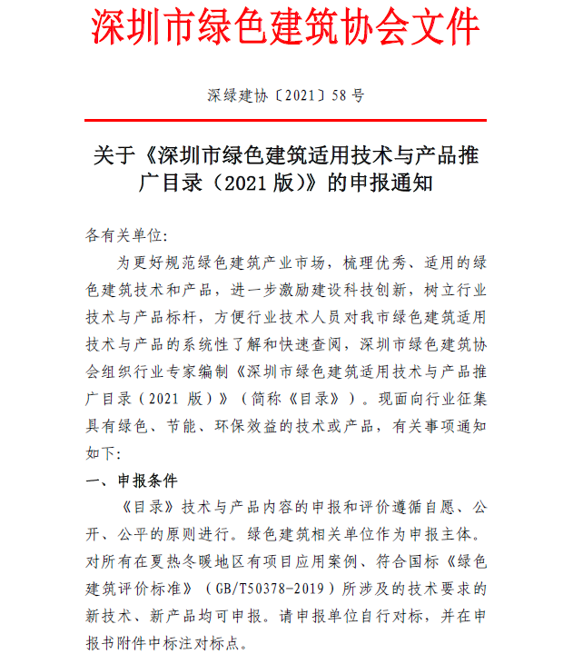 關(guān)于《深圳市綠色建筑適用技術(shù)與產(chǎn)品推廣目錄(2021版)》的申報(bào)通知