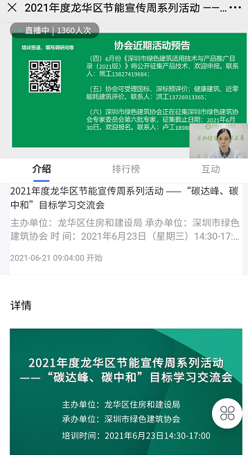 6月23日,由龍華區(qū)住房和建設(shè)局主辦、深圳市綠色建筑協(xié)會(huì)承辦的2021年度龍華區(qū)節(jié)能宣傳周系列活動(dòng)——“碳達(dá)峰、碳中和”目標(biāo)學(xué)習(xí)交流會(huì)在線上舉行。
