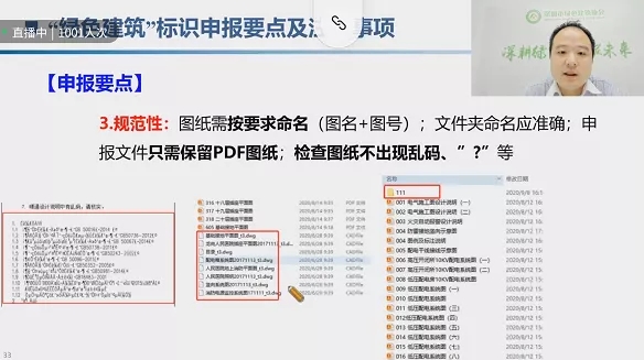 活動邀請四位專家,圍繞“深圳市綠色建筑(建筑節(jié)能)驗收重點分析、綠色物業(yè)運營及節(jié)能降碳實踐分享——深交所大樓(綠建運營高星項目)運營案例、深圳市裝配式建筑政策解析及案例分享、海綿城市建設與相關專業(yè)協(xié)同設計要點”等主題進行了詳細講解。據(jù)統(tǒng)計,此次線上培訓參與觀眾達1300人次。