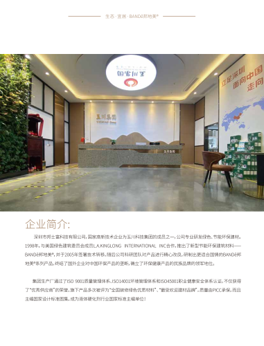 深圳市邦士富科技有限公司,國家高新技術(shù)企業(yè),深圳市高新技術(shù)企業(yè),深圳大學(xué)/武漢理工大學(xué)/蘭州大學(xué)研究生實習(xí)基地。邦士富科技遵循集團(tuán)“做良心產(chǎn)業(yè)”的核心價值觀,以做健康建材、自主創(chuàng)新、打造民族品牌為己命,堅持“寧可正而不足,不可邪而有余”的原則,專注于無機(jī)化、可循環(huán)生態(tài)化建筑材料的研究推廣及應(yīng)用。 深圳市邦士富科技有限公司,1999年與源于德國的綠色建筑委員會成員L.A.KINGLONG INTERNATIONAL INC企業(yè)合作,推出了無機(jī)、生態(tài)、節(jié)能的新型建材品牌---BANDě邦地美?,終結(jié)了國外企業(yè)對中國建筑行業(yè)無機(jī)生態(tài)類建材產(chǎn)品的壟斷,確立了邦士富科技在無機(jī)建材、節(jié)能建材、循環(huán)生態(tài)建材領(lǐng)域的民族品牌領(lǐng)軍地位!主編行業(yè)標(biāo)準(zhǔn)《滲透型液體硬化劑》和設(shè)計圖集《混凝土結(jié)晶硬化樓地面、墻面專項設(shè)計圖集》,被深圳市住建局評為“建筑工程新技術(shù)”產(chǎn)品。 集團(tuán)生產(chǎn)廠通過了ISO 9001質(zhì)量管理體系認(rèn)證、ISO14001環(huán)境管理體系認(rèn)證和18001安全與健康認(rèn)證體系,C-ROHS環(huán)保體系認(rèn)證,不僅獲得了眾多“優(yōu)秀供應(yīng)商”的榮譽,旗下產(chǎn)品多次被評為“全國裝修綠色優(yōu)質(zhì)材料”、“最受歡迎建材品牌”,產(chǎn)品質(zhì)量由中國財險PICC承保,產(chǎn)品得到中央電視臺展播... ... !