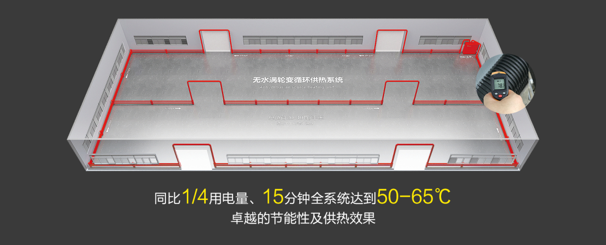 無(wú)水渦輪變循環(huán)供熱系統(tǒng),本系統(tǒng)經(jīng)實(shí)際案例論證,該技術(shù)在達(dá)到同等溫度下將工業(yè)、設(shè)施農(nóng)業(yè)電采暖的每平米功耗從傳統(tǒng)的120-160瓦,降低至20-40瓦,大幅降低了配電負(fù)荷,減少了供電設(shè)施投入,節(jié)約了電力消耗,減輕了用戶采暖負(fù)擔(dān)。 該系統(tǒng)最大的優(yōu)點(diǎn)是在系統(tǒng)運(yùn)行中不添加任何液體,所以無(wú)跑冒滲漏之憂,即便是在冬季-40℃極限氣候條件下停止供暖也不至于發(fā)生管道凍裂、損壞系統(tǒng)設(shè)備等等事故,全智能化運(yùn)行, 無(wú)需值守,可實(shí)現(xiàn)不同區(qū)域不同溫度分段控制,滿足客戶個(gè)性化節(jié)能供熱需求,并且可做到零排放、零污染、低成本運(yùn)行。