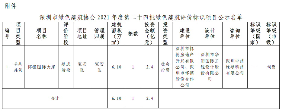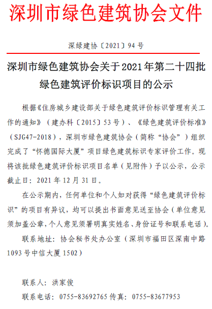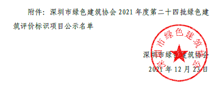 深圳市綠色建筑協(xié)會(huì)關(guān)于2021年第二十四批綠色建筑評(píng)價(jià)標(biāo)識(shí)項(xiàng)目的公示