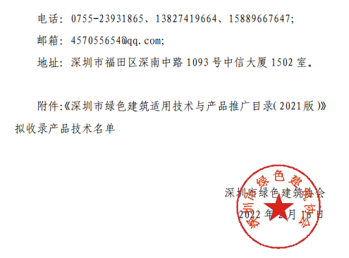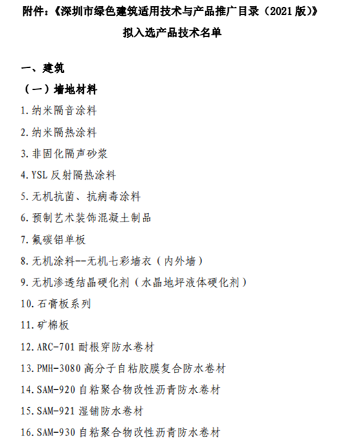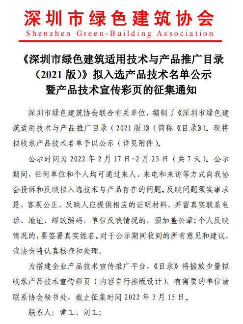 《深圳市綠色建筑適用技術(shù)與產(chǎn)品推廣目錄(2021版)》擬入選產(chǎn)品技術(shù)名單公示暨產(chǎn)品技術(shù)宣傳彩頁的征集通知