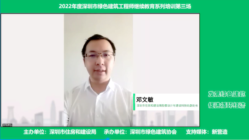 7月29日下午,由深圳市住房和建設(shè)局主辦、市綠色建筑協(xié)會(huì)承辦、市住房與房地產(chǎn)雜志社新營(yíng)造雜志支持的“深圳市綠色建筑工程師繼續(xù)教育第三場(chǎng)培訓(xùn)”于線上舉行。