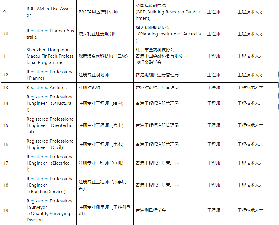 《目錄》指出,LEED AP、BREEAM AP、BREEAM INC Assessor、BREEAM In-Use Assessor、香港注冊建筑師、香港注冊專業(yè)工程師、香港注冊專業(yè)規(guī)劃師等國際職業(yè)資質(zhì)(詳見附表),均可視為工程類中級職稱。如滿足學(xué)歷資歷等要求,可直接申報(bào)副高級工程師職稱。