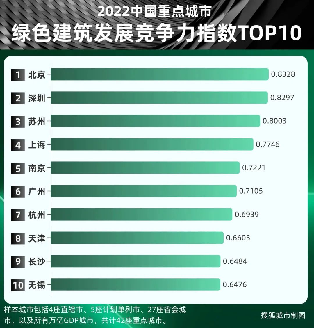 12月29日,“2022中國城市綠色建筑發(fā)展競爭力指數(shù)報告發(fā)布會”舉行。會上,《2022中國城市綠色建筑發(fā)展競爭力指數(shù)報告》(簡稱《報告》)正式發(fā)布。《報告》顯示,42座重點城市中(4座直轄市、5座計劃單列市、27座省會城市以及6個萬億GDP城市),綠色建筑發(fā)展競爭力指數(shù)十強城市分別是:北京、深圳、蘇州、上海、南京、廣州、杭州、天津、長沙和無錫,深圳繼續(xù)名列榜單前茅。