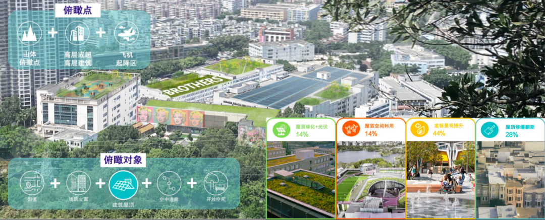 創(chuàng)新性地提出了“城市第六立面提升專項(xiàng)行動(dòng)”,在高處俯瞰點(diǎn)的視角,統(tǒng)籌活化建筑屋頂、建筑立面以及建筑周邊場(chǎng)地、街道、空中連廊、開放空間等城市空間元素,提升城市景觀風(fēng)貌和空間資源利用。目前 90萬平方米的試點(diǎn)片區(qū)中,已經(jīng)推動(dòng)14%面積的“城市第六立面”通過加裝太陽能光伏系統(tǒng)、屋頂綠化等方式實(shí)現(xiàn)綠色化、低碳化升級(jí)。