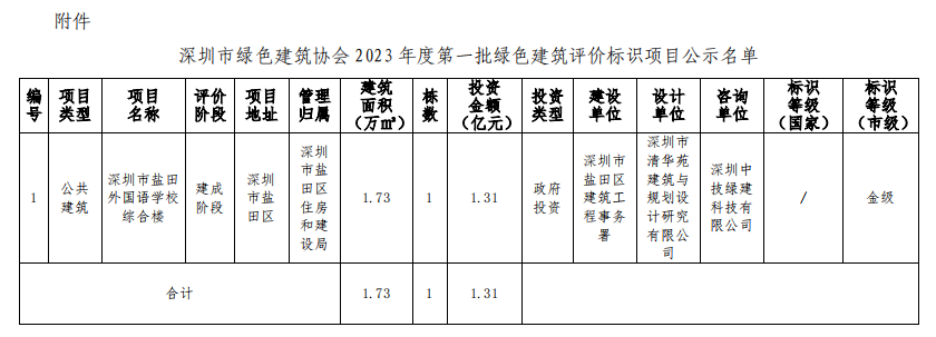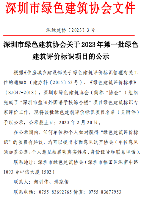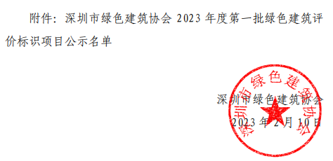 深圳市綠色建筑協(xié)會(huì)關(guān)于2023年第一批綠色建筑評(píng)價(jià)標(biāo)識(shí)項(xiàng)目的公示