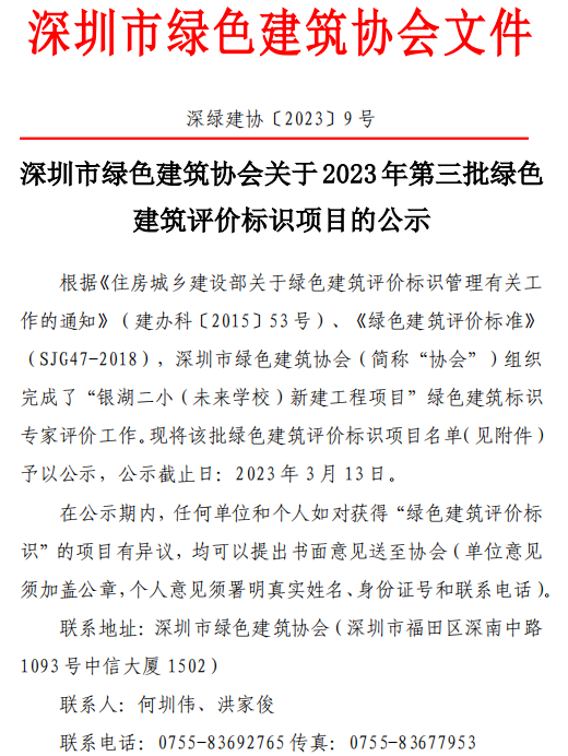 深圳市綠色建筑協(xié)會關于2023年第三批綠色建筑評價標識項目的公示
