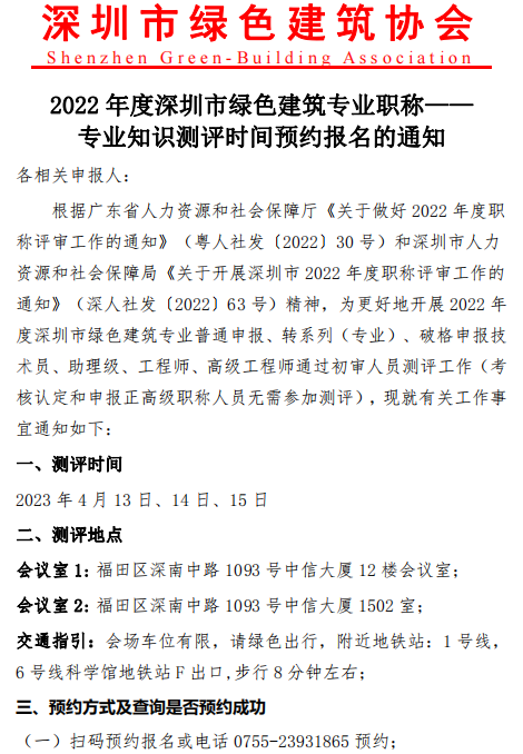 2022年度深圳市綠色建筑專業(yè)職稱——專業(yè)知識(shí)測評(píng)時(shí)間預(yù)約報(bào)名的通知