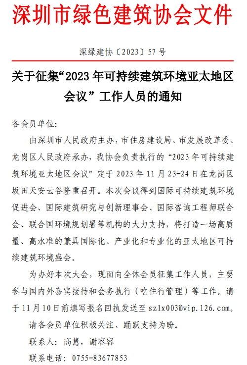 上一條:深圳市住房和建設(shè)局關(guān)于邀請參加2023年可持續(xù)建筑環(huán)境亞太地區(qū)會議的函