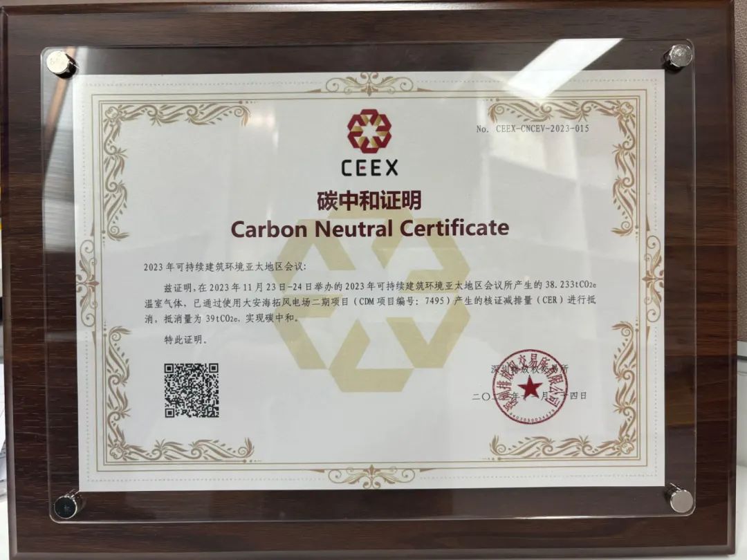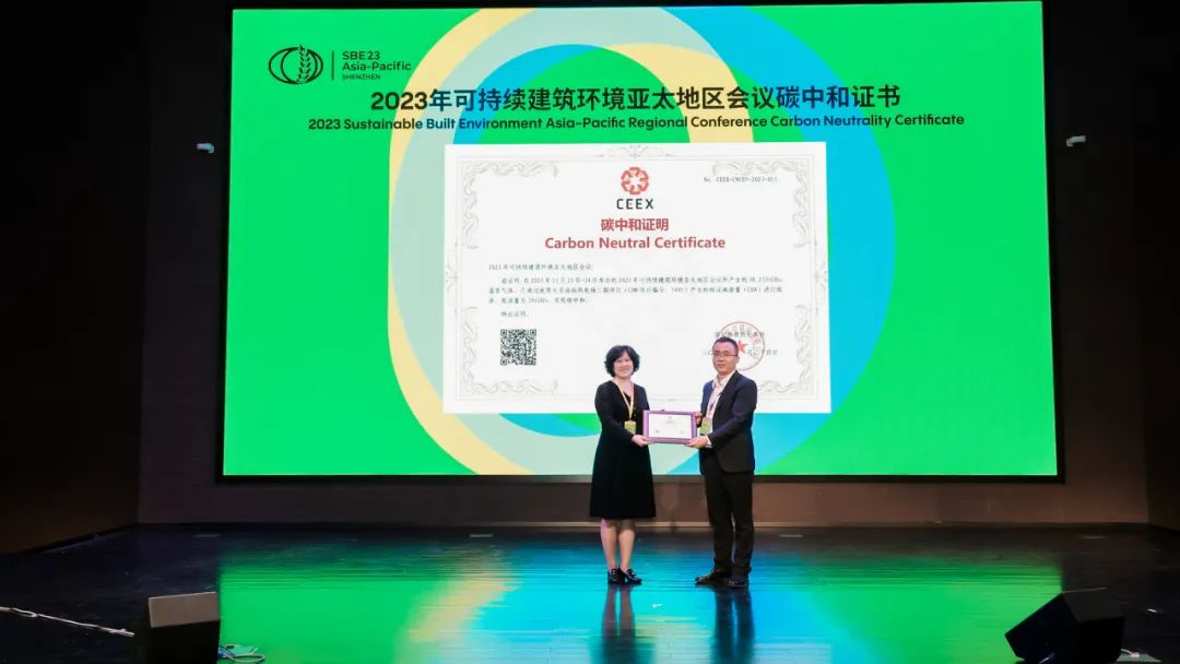 閉幕上舉行了“會議碳中和證書頒發(fā)儀式”,深圳排放權交易所有限公司總經理劉洋為會議執(zhí)行單位代表——深圳市綠色建筑協(xié)會秘書長王向昱頒發(fā)會議碳中和證書。