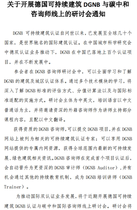 關(guān)于開展德國可持續(xù)建筑DGNB與碳中和咨詢師線上的研討會通知
