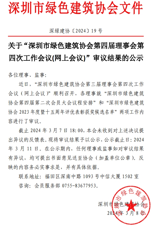 關(guān)于“深圳市綠色建筑協(xié)會(huì)第四屆理事會(huì)第四次工作會(huì)議”審議結(jié)果的公示