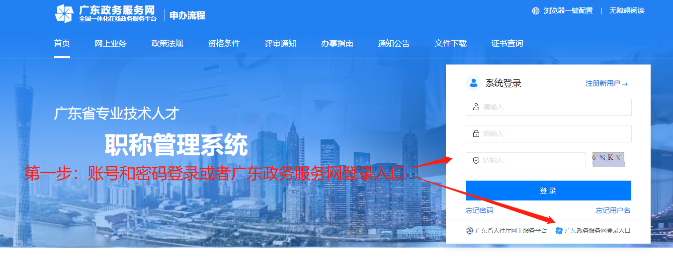 請使用IE8.0及以上瀏覽器訪問系統(tǒng)登錄“廣東省專業(yè)技術人才職稱管理系統(tǒng)”網(wǎng)址https://ggfw.hrss.gd.gov.cn/gdweb/ggfw/web/pub/ggfwzyjs.do(或通過登錄深圳市人才一體化平臺跳轉到此網(wǎng)站)。