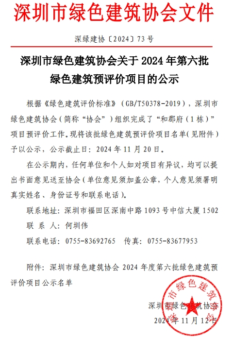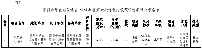 深圳市綠色建筑協(xié)會(huì)關(guān)于2024年第六批綠色建筑預(yù)評價(jià)項(xiàng)目的公示