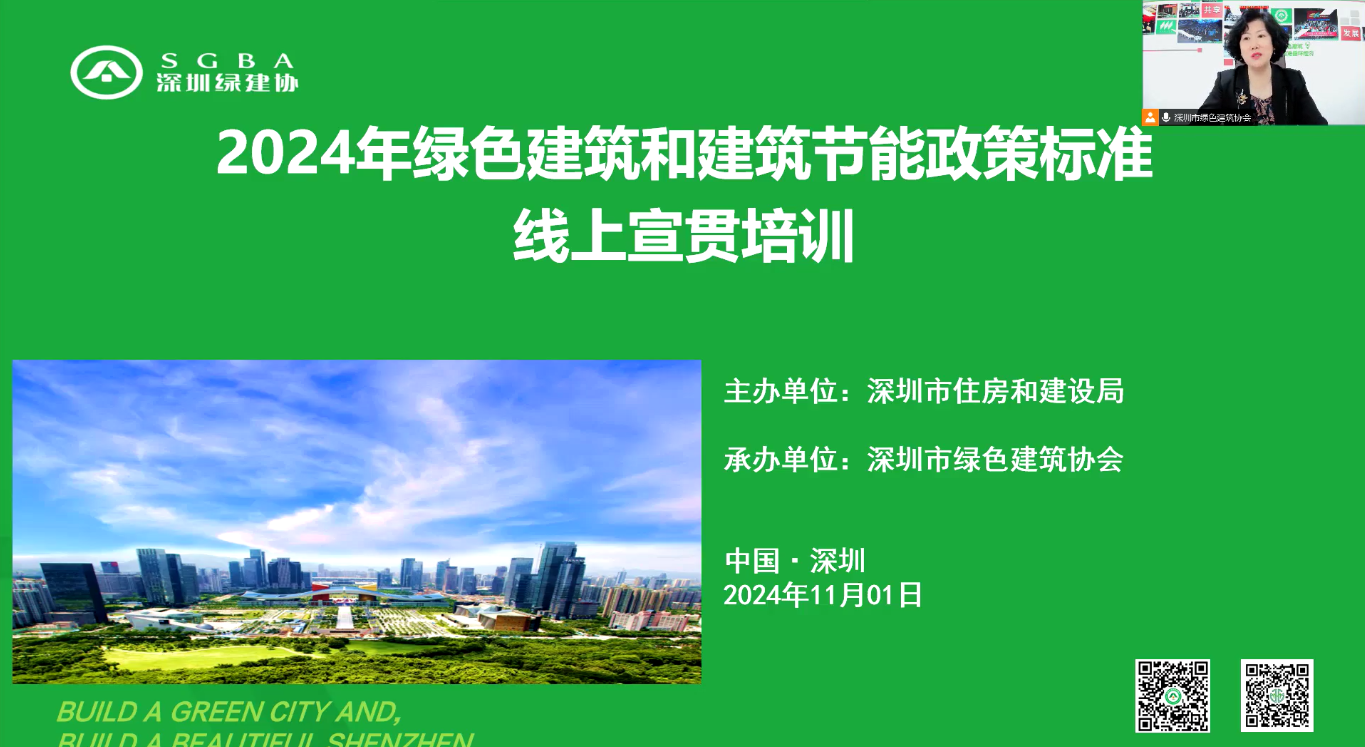 11月1日下午,由深圳市住房和建設(shè)局主辦、深圳市綠色建筑協(xié)會承辦的“2024年綠色建筑和建筑節(jié)能政策標(biāo)準(zhǔn)宣貫培訓(xùn)”在線上舉行,近300人參與此次培訓(xùn)。培訓(xùn)主要圍繞“《深圳市建筑節(jié)能改造節(jié)能量核定導(dǎo)則》編制背景、相關(guān)政策及重點(diǎn)章節(jié)、條文和創(chuàng)新點(diǎn)解讀”,以及“近零能耗和零碳建筑測評申報流程及要點(diǎn)”等內(nèi)容開展。