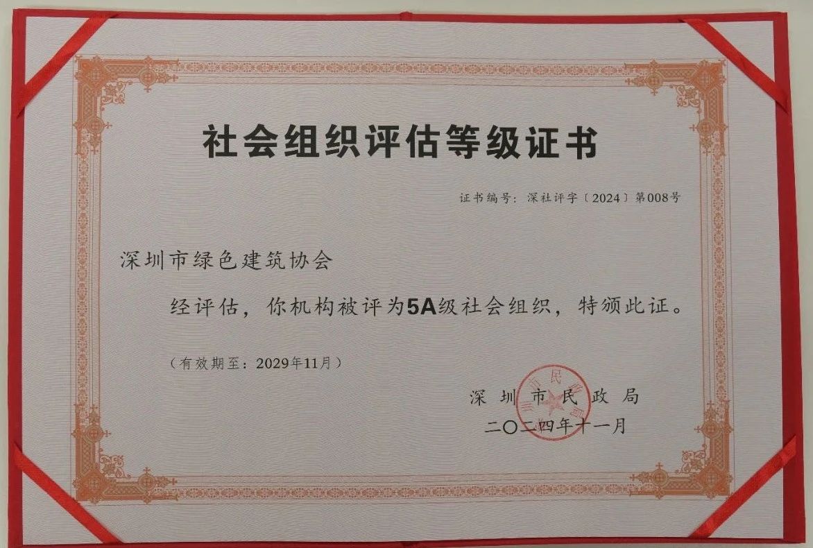 根據(jù)《社會組織評估管理辦法》(民政部令第39號)及《深圳市社會組織評估指南》有關(guān)規(guī)定,深圳市民政局發(fā)布了《2024年度深圳市市級社會組織等級評估結(jié)果公告》。深圳市綠色建筑協(xié)會認真自查、積極準備,順利通過專家團隊的嚴格評審,再次獲得社會組織評估最高等級——5A級社會組織。