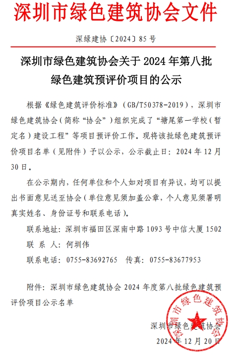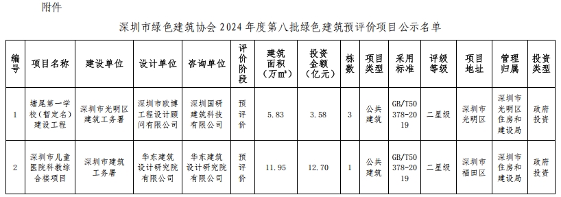 深圳市綠色建筑協(xié)會關(guān)于2024年第八批綠色建筑預(yù)評價項目的公示
