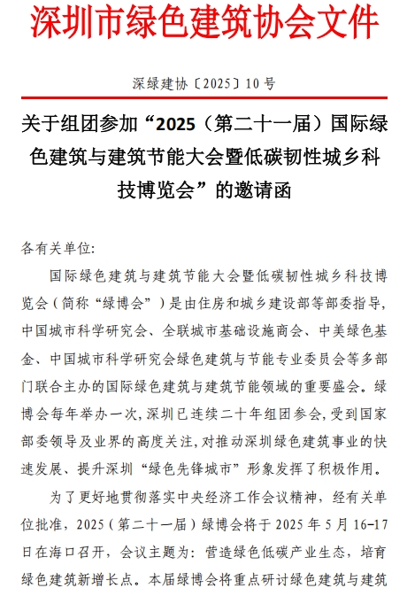 深圳市綠色建筑協(xié)會關(guān)于組團參加“2025(第二十一屆)國際綠色建筑與建筑節(jié)能大會暨低碳韌性城鄉(xiāng)科技博覽會”的邀請函