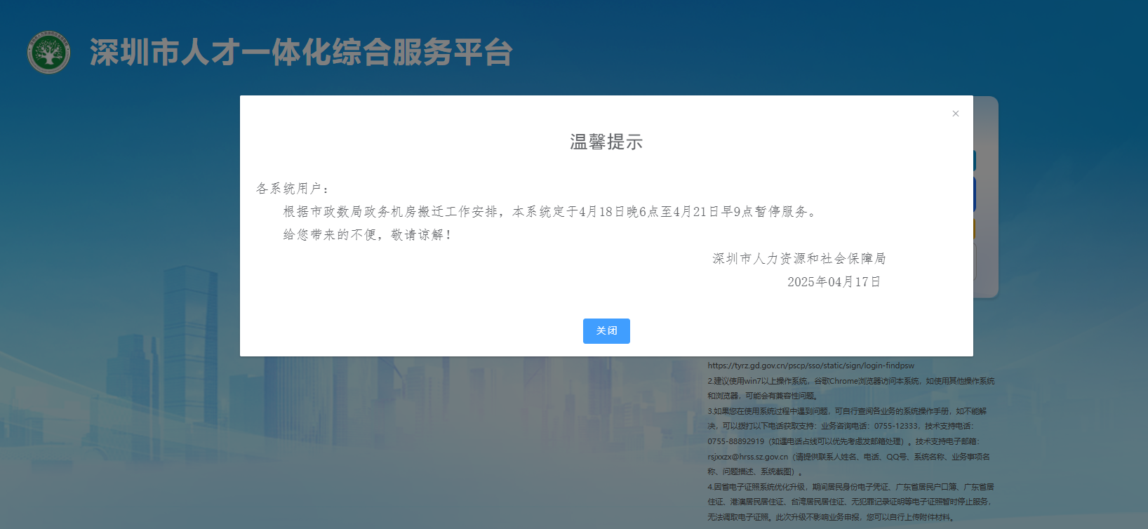 根據(jù)深圳市大數(shù)據(jù)資源管理中心相關(guān)工作安排,申報(bào)職稱系統(tǒng)——深圳市人才一體化綜合服務(wù)平臺(tái)擬于2025年4月18日18:00至4月21日 9:00暫停平臺(tái)服務(wù)功能,期間可能沒法填報(bào)資料,如有疑問請致電咨詢0755-23931865。敬請理解。請相互轉(zhuǎn)達(dá)。