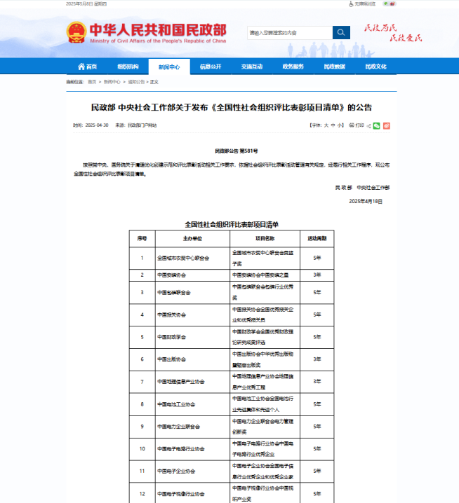 民政部 中央社會(huì)工作部關(guān)于發(fā)布《全國(guó)性社會(huì)組織評(píng)比表彰項(xiàng)目清單》的公告網(wǎng)址:https://www.mca.gov.cn/n152/n165/c1662004999980004737/content.html