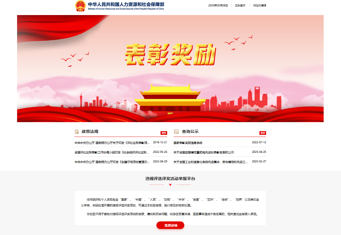 “表彰獎(jiǎng)勵(lì)”專欄網(wǎng)站:https://www.mohrss.gov.cn/SYrlzyhshbzb/rdzt/bzjl/