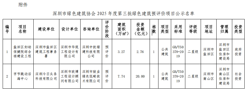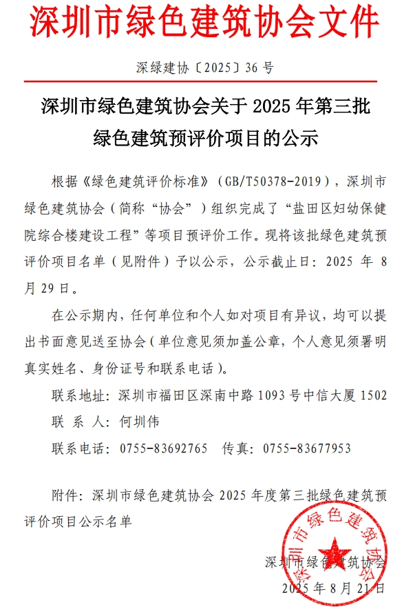 深圳市綠色建筑協(xié)會(huì)關(guān)于2025年第三批綠色建筑預(yù)評價(jià)項(xiàng)目的公示