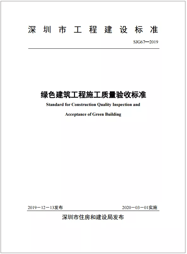 《綠色建筑工程施工質(zhì)量驗收標準》(SJG67-2019)由深圳市綠色建筑協(xié)會與深圳市建筑科學研究院股份有限公司共同主編,旨在推動綠色建筑發(fā)展,加強綠色建筑工程管理,統(tǒng)一綠色建筑工程施工質(zhì)量驗收標準,保障綠色建筑工程質(zhì)量,適用于深圳市范圍內(nèi)新建綠色民用建筑工程驗收,改建或擴建的綠色民用建筑工程可參照執(zhí)行。