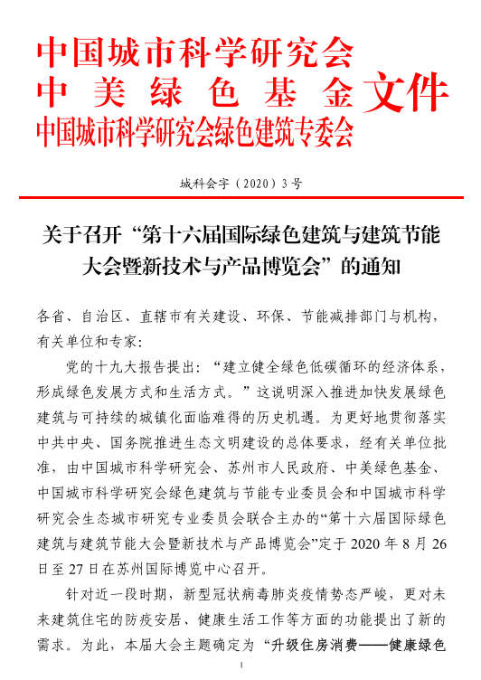 附件1:關(guān)于召開“第十六屆國際綠色建筑與建筑節(jié)能大會暨新技術(shù)與產(chǎn)品博覽會”的通知( 城科會字[2020]3號)
